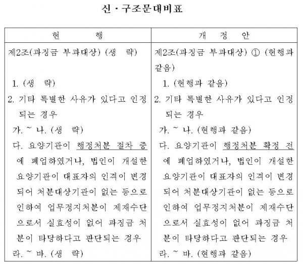 - 현지조사 대상 선정 후 현지조사 전에 폐업한 요양기관에서 발생한 위반 행위도 직권으로 과징금 부과 처분을 할 수 있도록 하여 처분의 적정성 확보 및 실효성을 제고 하고자 함 (안 제2조 제2호 다목)