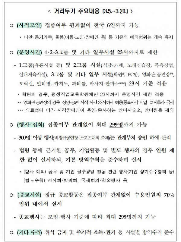 < 거리두기 주요내용 (3.5.~3.20.) >