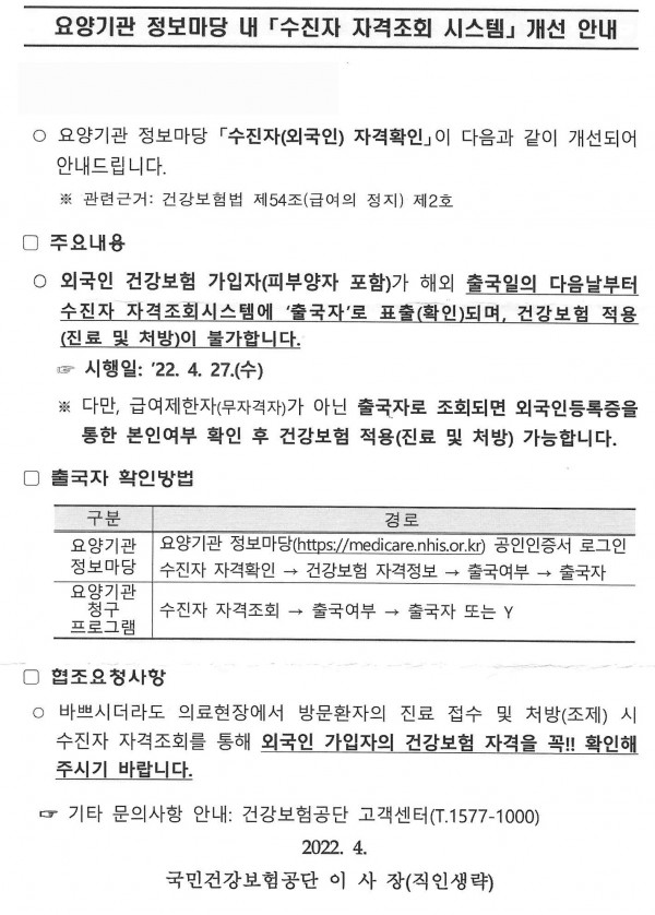 국민건강보험공단에서 법무부 자료 연계를 통해 요양기관 정보마당 내 ‘수진자 자격조회 시스템’에 외국인 출입국 자료가 매일 반영되어 외국인 자격확인 사항이 변경되었음을 안내 하였습니다.
