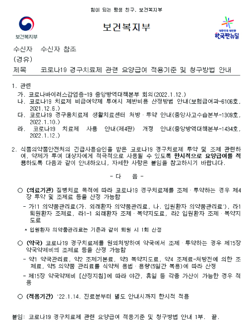 나. 위와 관련, 「코로나19 경구치료제 관련 요양급여 적용기준 및 청구방법 안내」를 다음과 같이 안내드립니다.