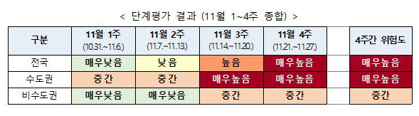○ 최근 4주간 위험도는 매주 악화되었으며, 수도권은 2주 연속 “매우 높음”으로 평가되었다.