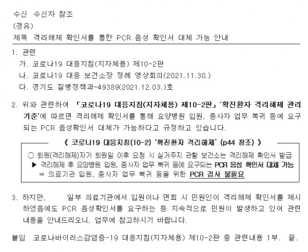 '격리해제 확인서'로 요양병원 입원, 종사자 업무 복귀 등에 요구되는 'PCR 음성 확인서' 대체가 가능하며,