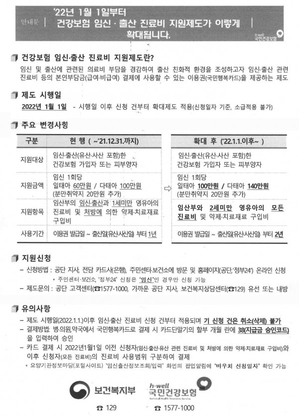 [건보공단]건강보험 임신·출산 진료비 지원제도 확대 변경(‘22. 1. 1. 부터) 대피연 메일보내기 이름으로 검색 0 10,330 2021.12.20 14:28 첨부파일 - 첨부파일: 임신출산지원.jpg (999.8K) 342 짧은주소 - 짧은주소: https://www.laserpro.or.kr:443/bbs/?t=9fp 주소복사 × 짧은 글주소 복사 Note! 위 주소를 드래그, 복사(Ctrl+C)하여 사용하세요. 이전글다음글 목록 본문 [건보공단]건강보험 임신·출산 진료비 지원제도 확대 변경(‘22. 1. 1. 부터) 이전글다음글 목록 댓글목록 등록된 댓글이 없습니다.