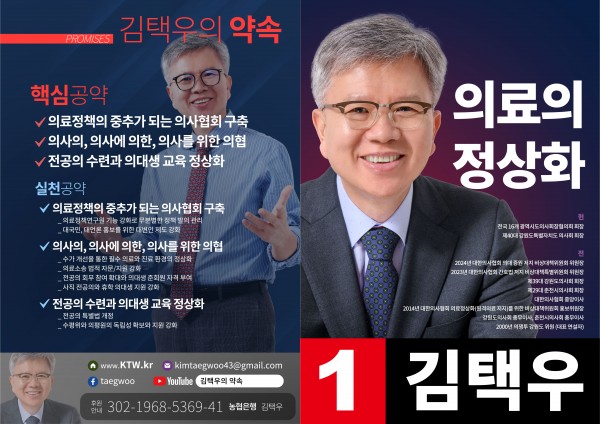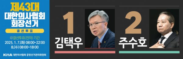 지난 1월 2일부터 사흘간 진행된 '제43대 대한의사협회 회장선거' 투표 결과, 기호 1번 김택우 후보와 기호 3번 주수호 후보가 결선에 진출했다.