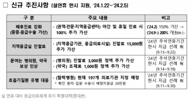 정부는 해당 기간 동안 ▲응급실 전문의 진찰료 250%(권역·전문)-150%(지역)가산 ▲응급센터 중증·응급수술 200% 가산 ▲응급의료기관 응급의료행위시 150% 가산 ▲지역응급실 진찰료 1만 8870원 보상 ▲발열클리닉 공휴·심야 진료시 3만원 가산 등 기존 지원 사항들을 유지해 나가겠다고 했다.