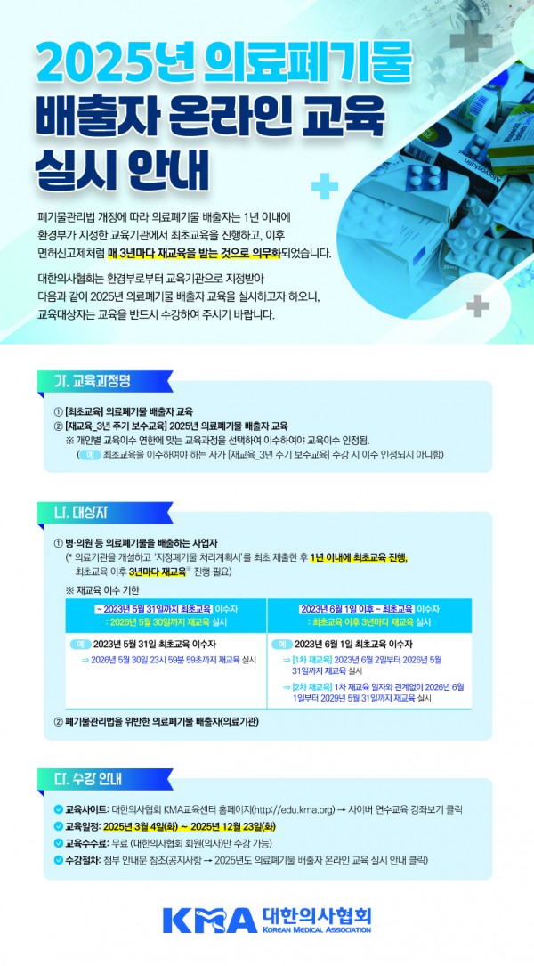 이에 대한의사협회는 환경부로부터 교육기관으로 지정받아 2025년 의료폐기물 배출자 교육을 실시함을 알려온 바, 귀 회 소속 회원들이 동 교육을 이수할 수 있도록 적극 안내해 주시기 바랍니다.
