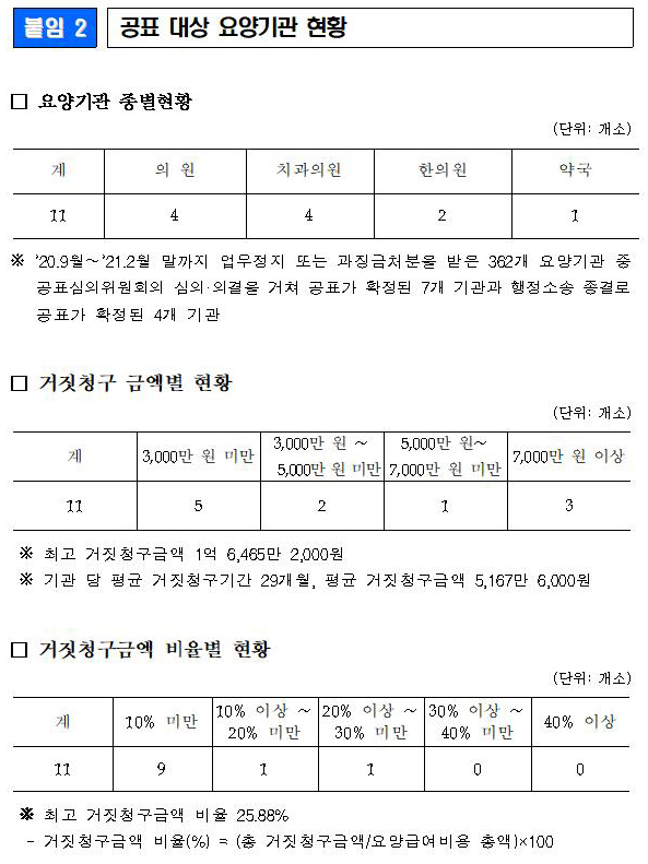 □ 보건복지부(장관 권덕철)는 건강보험 요양급여비용을 거짓으로 청구한 요양기관의 명단을 보건복지부 누리집 등을 통해 9월 6일(월) 12시부터 공표한다고 밝혔다.