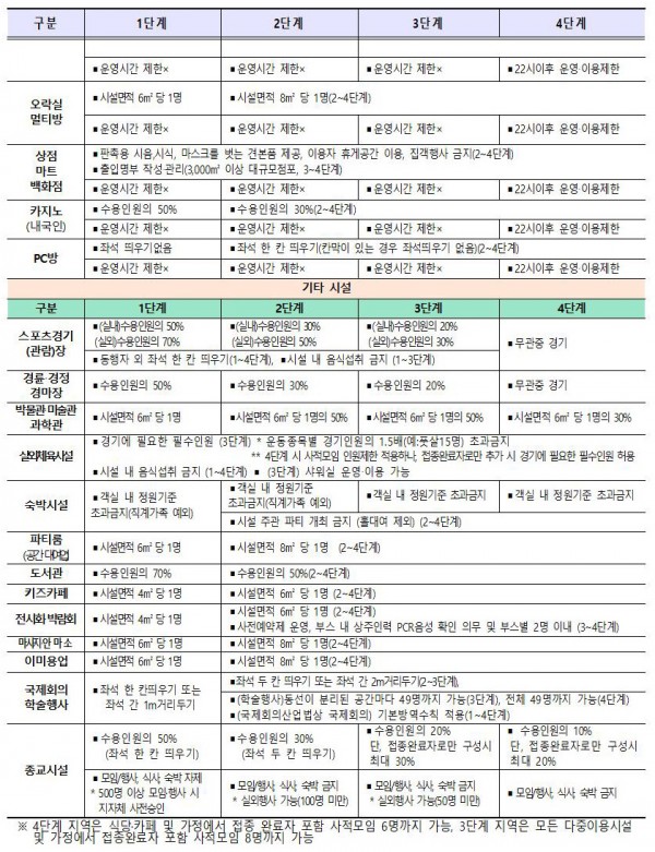 □ 종교시설은 접종 완료자 중심으로 예배 인원을 확대하되, 소모임·식사·숙박 금지 등은 유지된다.