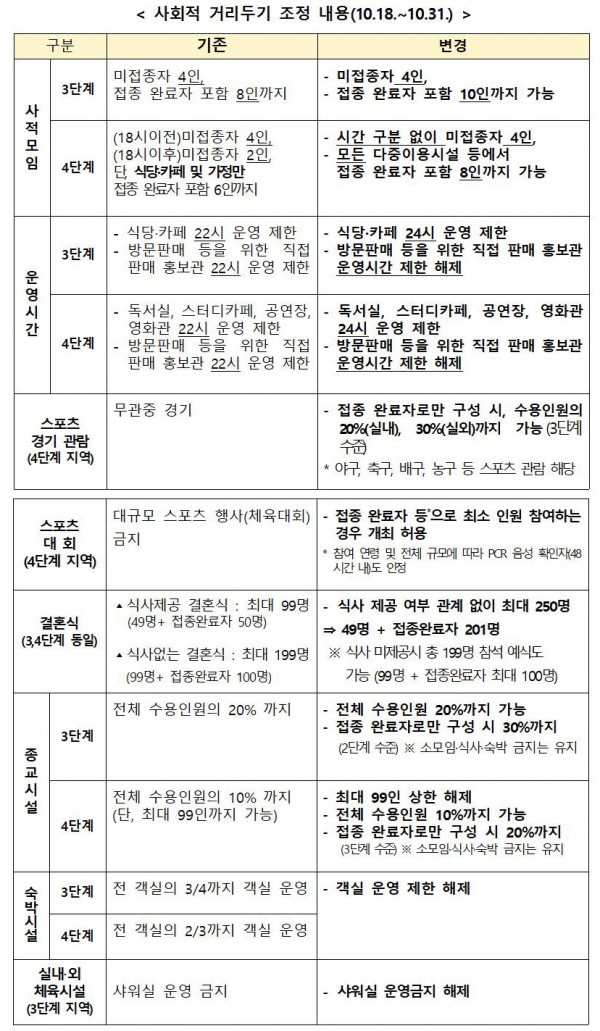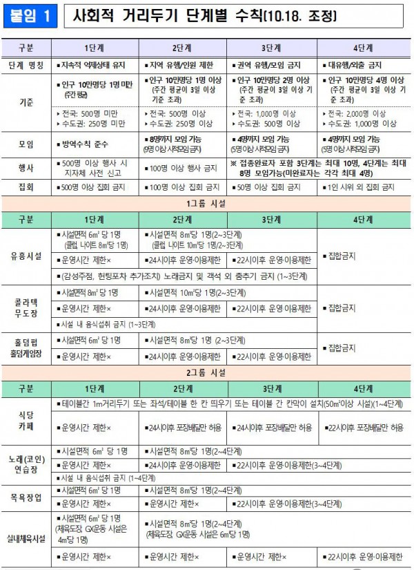 □ 10월 18일(월) 0시부터 10월 31일(일) 24시까지 2주간 적용될 이번 사회적 거리두기 조정 내용은 다음과 같다.