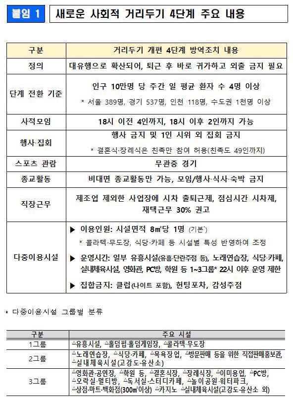 새로운 거리두기 4단계는 가장 최후의 단계로서 대유행 차단을 위해 사회적 접촉을 최소화해야 한다.