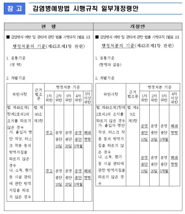 개정(강화) 내용은 현행 방역지침 1차 위반 시의 행정처분 기준인 ‘경고’를 ‘운영중단 10일’로 강화하는 등 2~5차 위반 시의 기준을 1~4차 위반 시의 기준으로 한 단계씩 강화하는 것이다(시행규칙 별표 10).