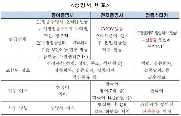 - 종이증명서, 전자증명서, 접종스티커에 대한 상세 비교·안내
