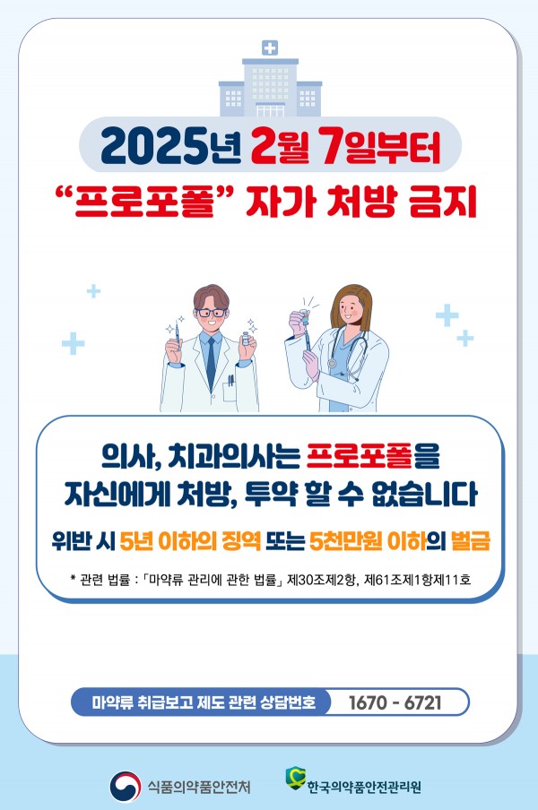 2025년 2월 7일부터 의료인이 자신에게 '프로포폴'을 처방하는 행위가 전면 금지된다.