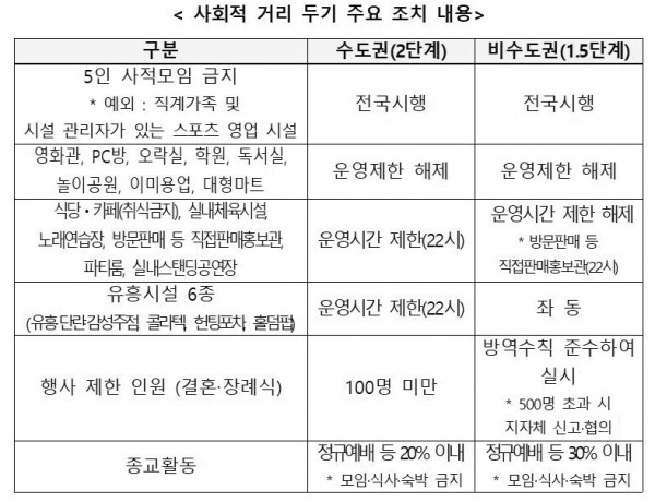 또한, 실내체육시설, 노래연습장, 방문판매 등 직접판매홍보관, 학원교습소, 파티룸, 실내스탠딩공연장은 22시까지 운영이 가능하다.