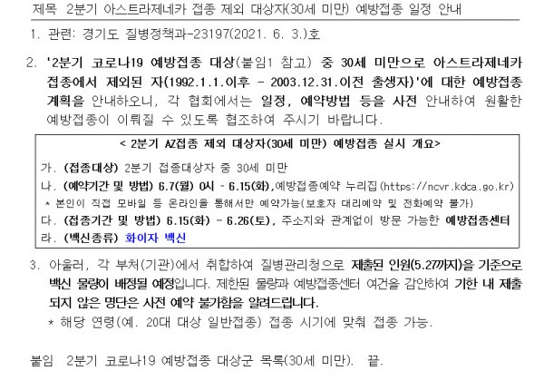 [2분기 아스트라제네카 접종 제외 대상자(30세 미만) 예방접종 일정 안내] 공문 첨부해드립니다.