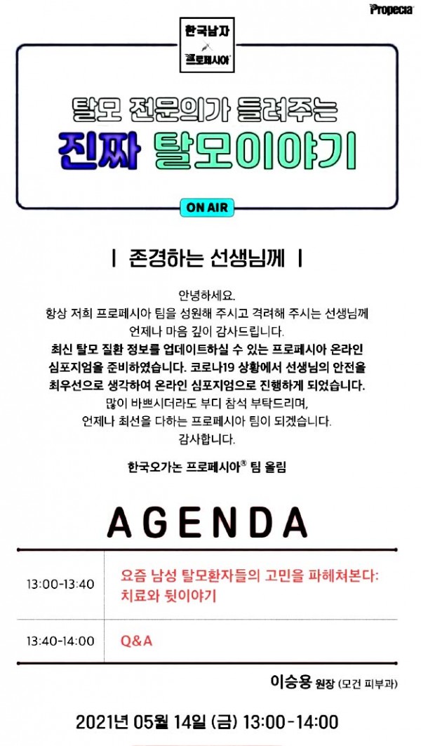 프로페시아에서 ’요즘 남성 탈모환자들의 고민을 파헤쳐 본다(치료와 뒷이야기)‘라는 주제로 모건피부과 이승용 원장의 Webcast 강의가 있다고 합니다.
