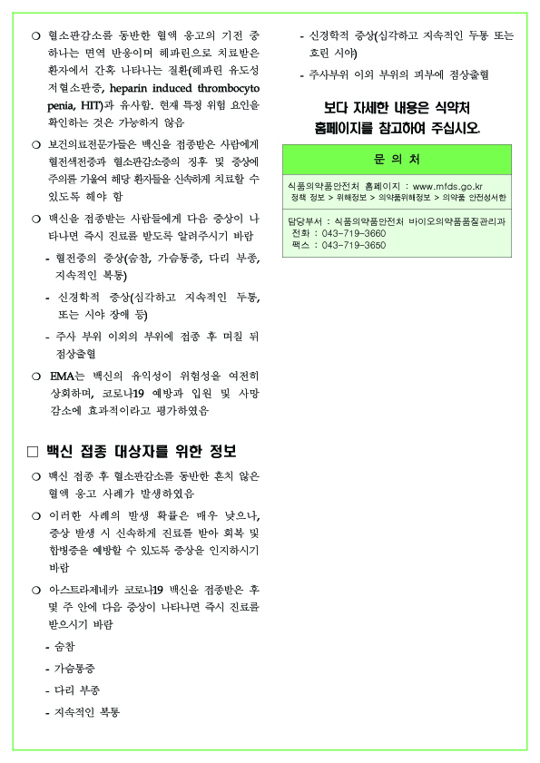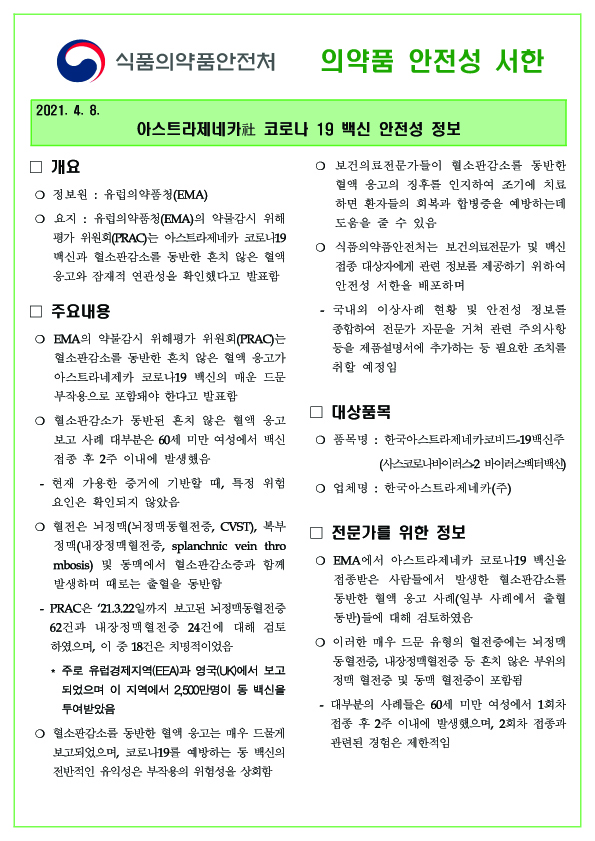 [식약처]아스트라제네카 코로나 19 백신 안전성 정보 대피연 메일보내기 이름으로 검색 0 10,942 2021.04.09 10:57 첨부파일 - 첨부파일: 의약품 안전성 서한아스트라제네카코로나백신.pdf (143.0K) 118 - 첨부파일: 의약품 안전성 서한1.jpg (1.1M) 115 - 첨부파일: 의약품 안전성 서한2.jpg (927.0K) 148 짧은주소 - 짧은주소: https://www.laserpro.or.kr:443/bbs/?t=7Qs 주소복사 × 짧은 글주소 복사 Note! 위 주소를 드래그, 복사(Ctrl+C)하여 사용하세요. 이전글다음글 목록 본문 [식약처]아스트라제네카 코로나 19 백신 안전성 정보 이전글다음글 목록 댓글목록 등록된 댓글이 없습니다.