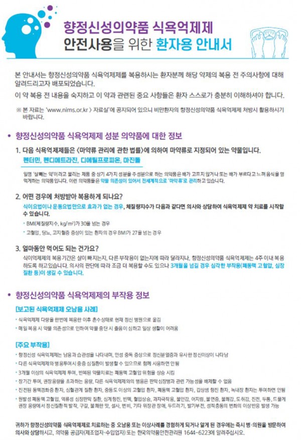 ‘환자용 안내서’에는 ▲식욕억제제는 마약류로서 약물에 대한 의존성이 있음을 충분히 인지해 사용하고 ▲오남용이나 이상사례를 경험하면 즉시 의사와 상담하고 의약품안전관리원에 신고해야 한다는 내용 등을 담았습니다.