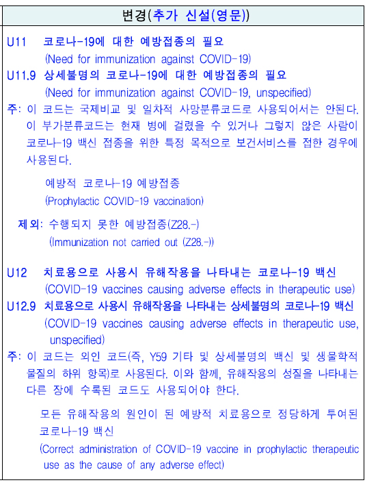 「코로나-19에 대한 예방접종의 필요」등 한국표준질병‧사인분류 코드 추가 신설