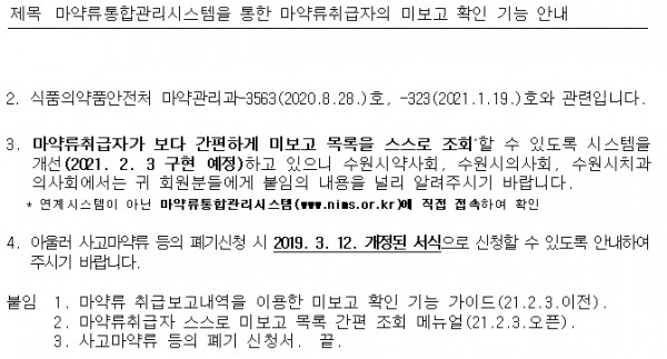 마약류취급자의 미보고 확인 기능이 마약류통합관리시스템을 통하여 가능하다고 합니다