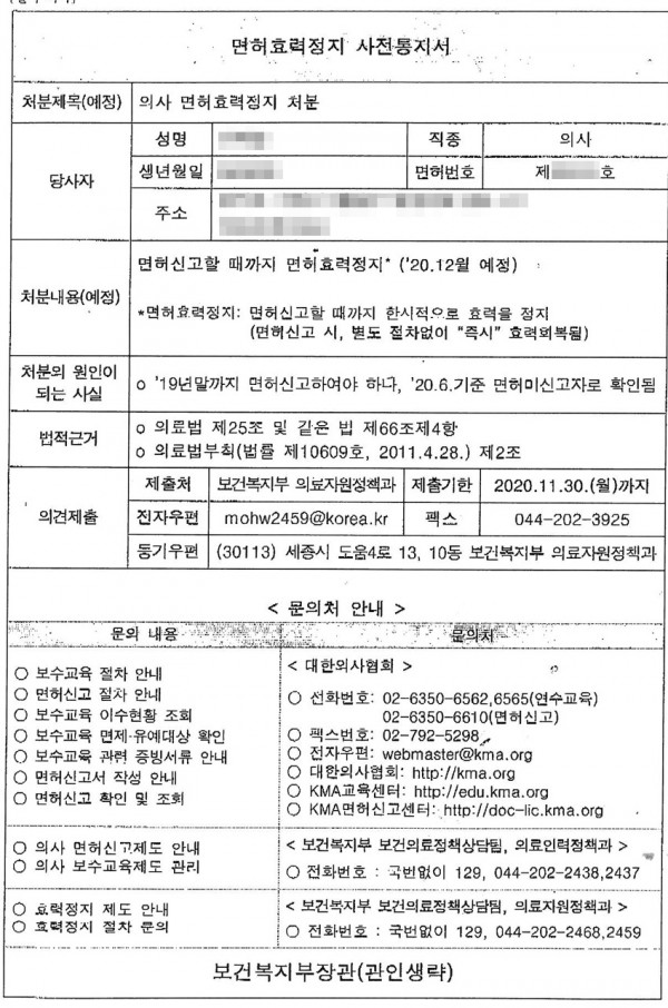 복지부는 면허 효력정지 사전통지를 받은 의료인은 이달 30일까지 면허신고를 완료하고 의견제출서(면허신고 완료)를 내라고 주문했다.