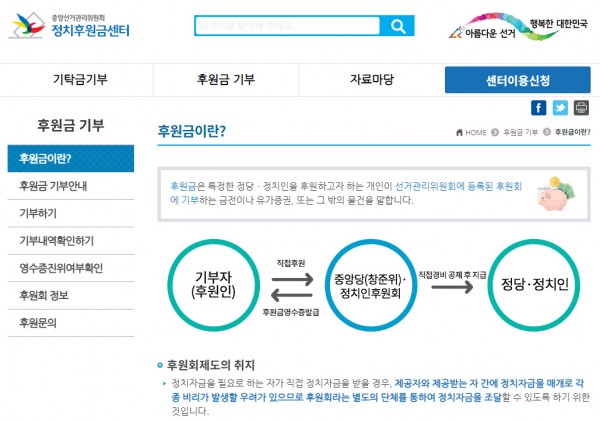 중앙선거관리위원회-->정치후원금센터-->후원금기부-->기부하기