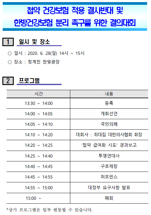 - 의협, 첩약 급여화 규탄 결의대회 28일 오후2시 청계천 한빛광장서 개최