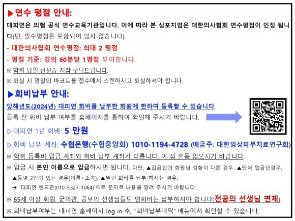 - 회비 납부 계좌: 수협은행(수협중앙회) 1010-1194-4728 (예금주: 대한임상피부치료연구회)