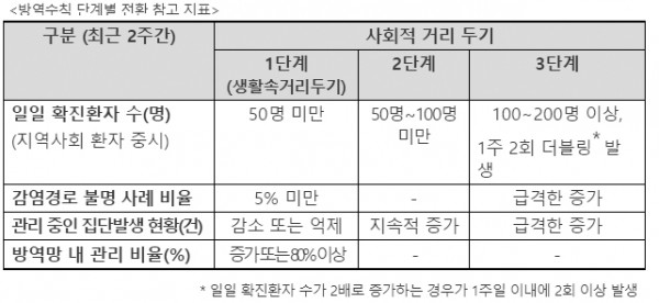 이에 거리 두기 조정의 예측 가능성 및 신뢰도를 높이고자 단계별 전환 기준 및 조치 사항을 명확하게 재정비하였다.