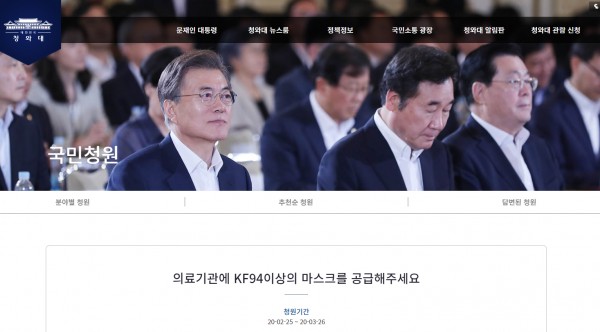 의료기관에 KF94이상의 마스크를 우선 공급해 줄 것을 요청하는 청와대 국민 청원입니다.