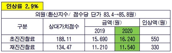 이를 반영한 내년도 의원 초진료는 올해보다 550원 오른 1만 6240원, 재진료는 330원 오른 1만 1540원이 된다.