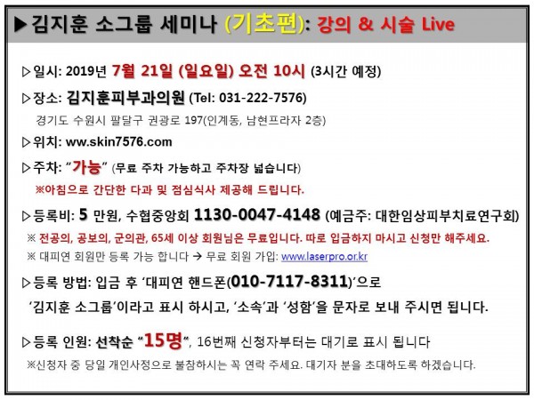 ▷등록비: 5 만원, 수협중앙회 1130-0047-4148 (예금주: 대한임상피부치료연구회)