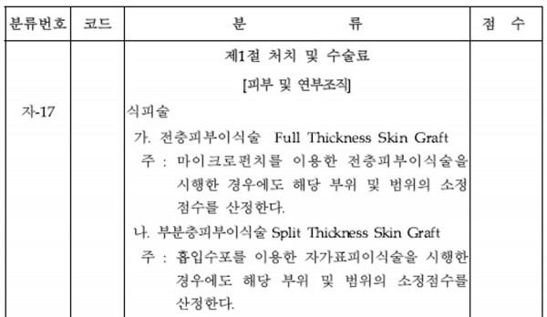 (‘자-17 식피술 가. 전층피부이식술 Full Thickness Skin Graft’)