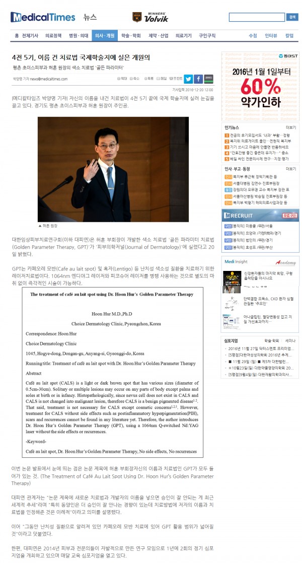 이번 논문 발표에서 눈에 띄는 점은 논문 제목에 허훈 부회장자신의 이름과 치료법인 GPT가 모두 들어가 있는 것. (The Treatment of Café Au Lait Spot Using Dr. Hoon Hur’s Golden Parameter Therapy)