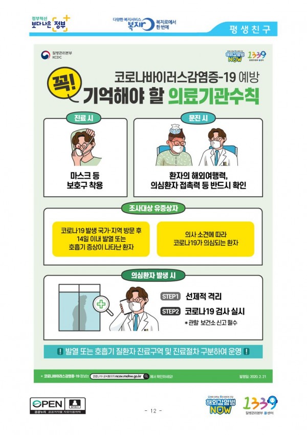 특히, 국민들이 안심하고 병원지료를 받을 수 있도록 비호흡기 환자와 완전히 분리된 호흡기 환자 전용 진료구역을 운영하는 ‘국민안심병원’을 도입(2.22~, 신청접수)하고, 환자가 의료기관을 방문하지 않고도 전화 등을 통해 상담 및 처방을 받을 수 있도록 한다.