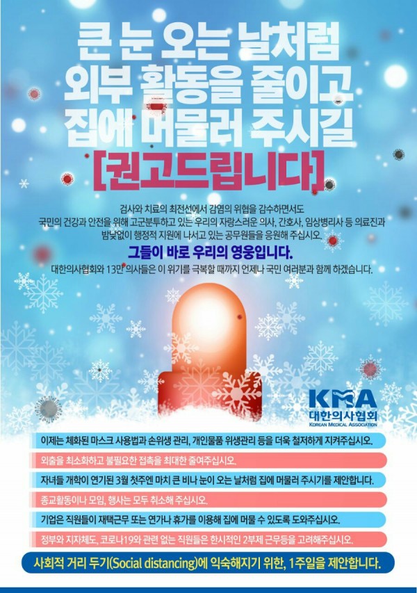 [의협]대국민 권고문, “큰 눈 오는 날처럼 외부 활동 줄이고 집에 머물자”