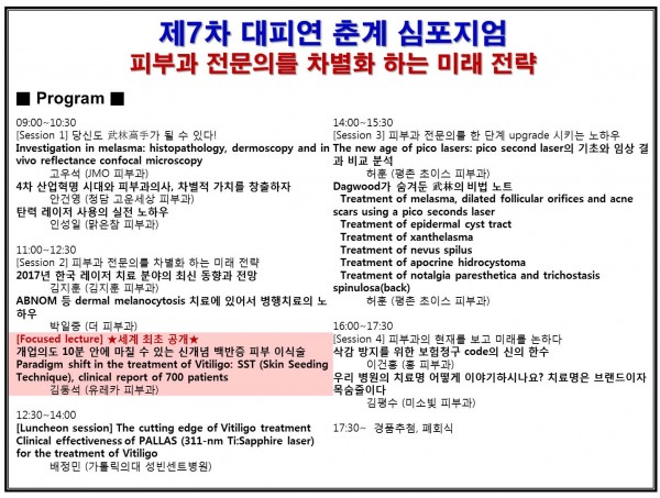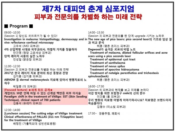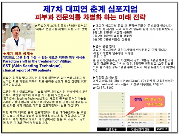 이번 제7차 대피연 춘계 심포지엄에서 회원 여러분들께서는 백반증 치료의 새롭고 놀라운 임상경험을 하시게 될 것입니다. GPT에 이어서 세계 최초로 오로지 대피연에서만 들을 수 있는 SST 강의에 많은 기대와 관심 부탁드립니다.