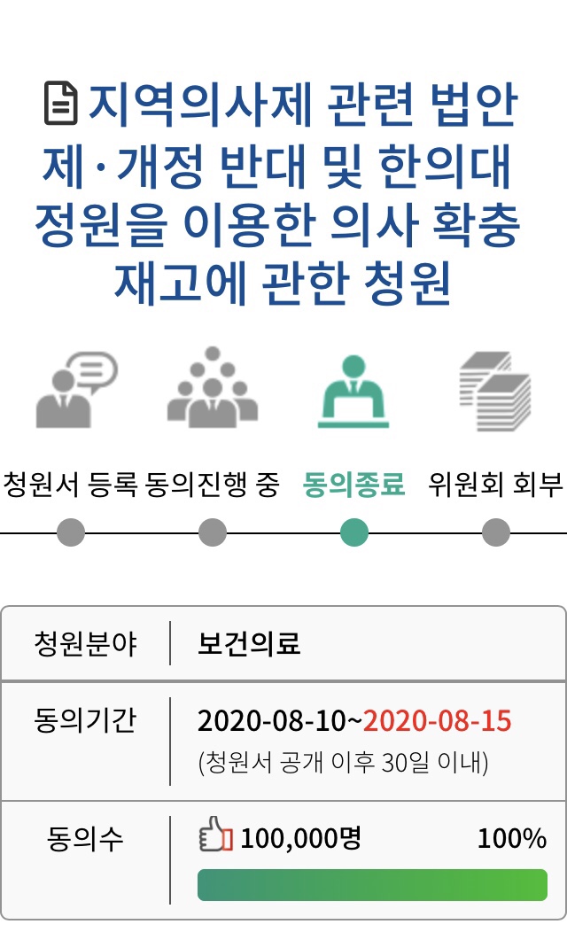 지역의사제 관련 법안 제·개정 반대 및 한의대 정원을 이용한 의사 확충 재고에 관한 청원이 국회 ‘국민동의청원’이 10만명 이상이 동의하여 완료되었습니다.