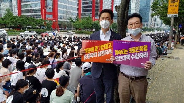 그리고 일주일전 7일에는 바로 이 자리에서 ‘2020 젊은 의사 단체행동’이 열려 앞으로 대한민국 의료의 주역이 될 전공의들과 의대생들이 정부의 일방적 보건의료정책의 객체가 되기를 거부하는 함성을 단호하고 당당하게 들려주었습니다.