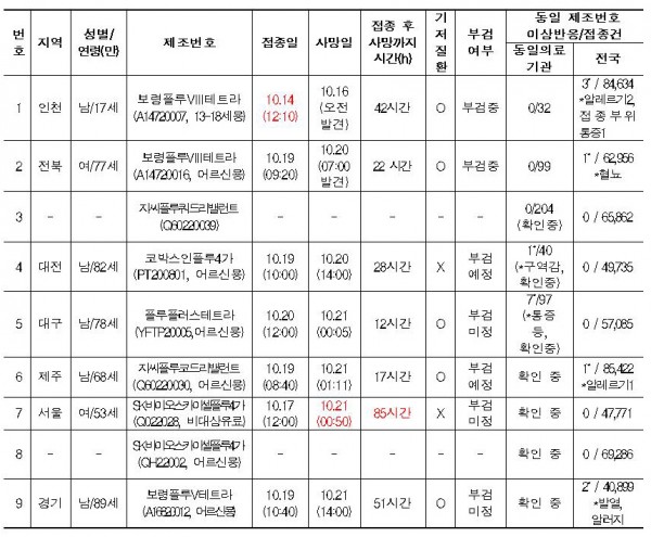 현재까지(10.21. 14시 기준) 사망 사례는 총 9건 보고되어 그 중 7건(2건은 유가족의 요청에 의해 공개하지 않음)에 대해 역학조사 및 사인을 밝히기 위한 부검 등이 진행 중이며, 동일 날짜에 같은 의료기관에서 동일 백신 제조번호로 접종받은 접종자에 대해 이상반응 발생 여부를 모니터링 중이다.