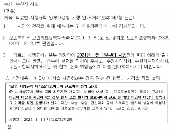 - 개정내용 : 비급여 대상을 제공하려는 경우 진료 전 항목과 가격을 직접 설명해야 한다.