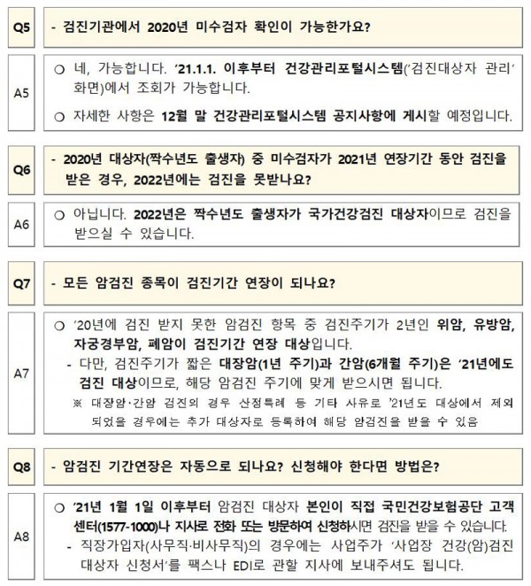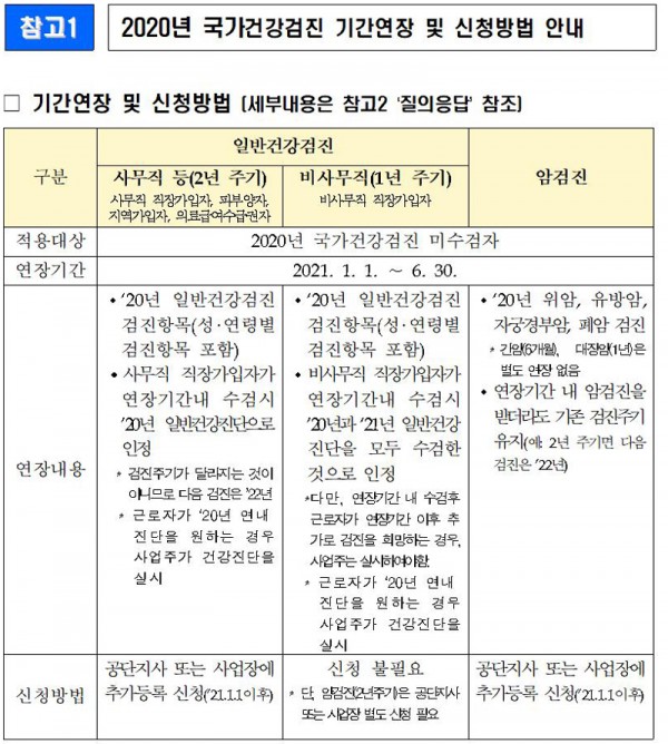 ‘사무직 근로자’ 등 2년 주기 검진 대상자(암검진 포함)가 2020년에 검진기관의 사정 등으로 검진을 받지 못하는 경우 2021년 6월까지의 연장기간 내 검진을 받을 수 있으며, 2021년 6월까지 검진 연장을 원하는 경우, 국민건강보험공단 지사 또는 해당 사업장에 2021년 1월 1일 이후 건강검진 대상자 추가등록 신청을 하여야 하고, 다음 검진은 2022년에 받게 된다.