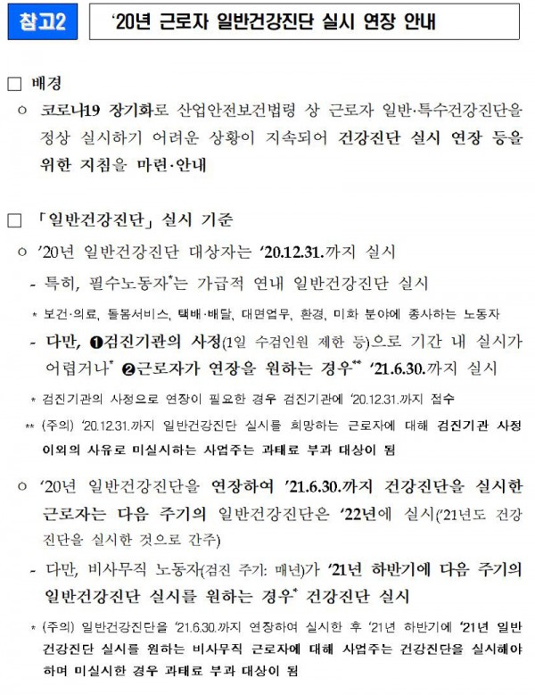 그러나, 사업주는 1)올해 일반건강진단 실시를 명시적으로 요구하는 근로자와 2)‘20년 일반건강진단을 연장하여 ‘21년 상반기에 실시하고, ‘21년 7월 이후에도 ‘21년 일반건강진단을 받고자 하는 비사무직 근로자에 대해서는 검진기관 사정이 없는 한 건강진단을 실시하여 근로자의 건강진단 받을 권리를 보장해 주어야 한다.