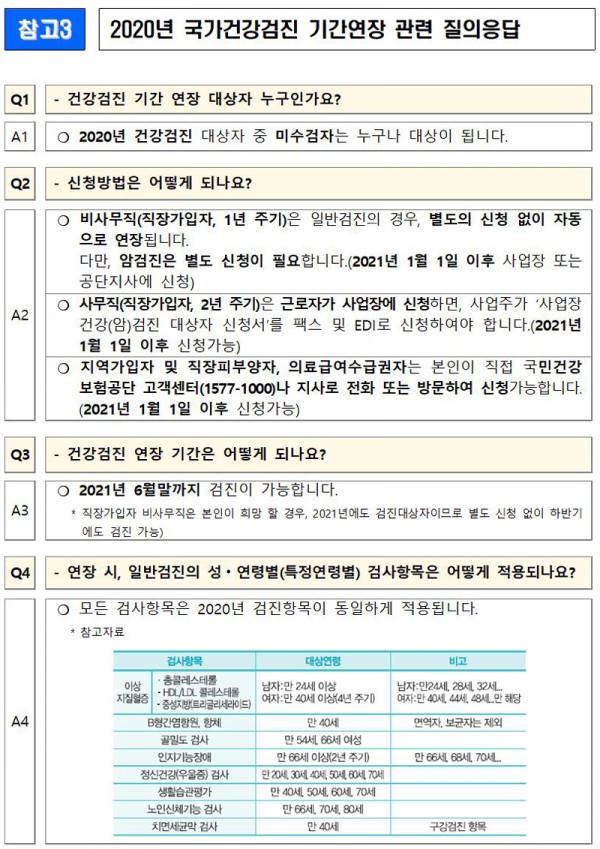 연장 대상은 2020년도 일반건강검진 및 암검진으로, 성별·연령별 검진이 포함된다.