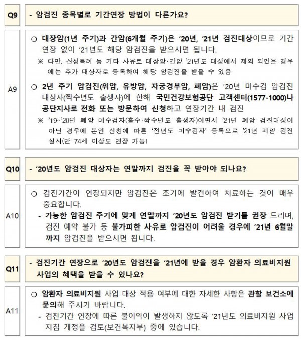 이번 국가건강검진 기간연장은 코로나19 장기화라는 특수한 상황을 고려한 한시적 조치로, 암을 포함한 기저질환이 있는 경우 코로나19에 더 취약한 만큼암검진은 가급적 연도 내 검진을 받으실 것을 권고한다.