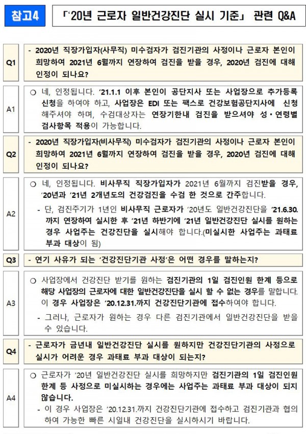고용노동부는 근로자가 요청하거나 검진기관의 사정(1일 검진인원 제한 등)으로 사업주가 ‘20년도 일반건강진단을 ‘21년 6월까지 연장하여 실시하는 경우 과태료를 부과하지 않기로 하였다.