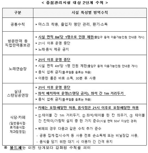 - 더불어, 중점관리시설에는 마스크 착용, 출입자 명단 관리, 환기·소독 등이 공통적으로 의무화된다.