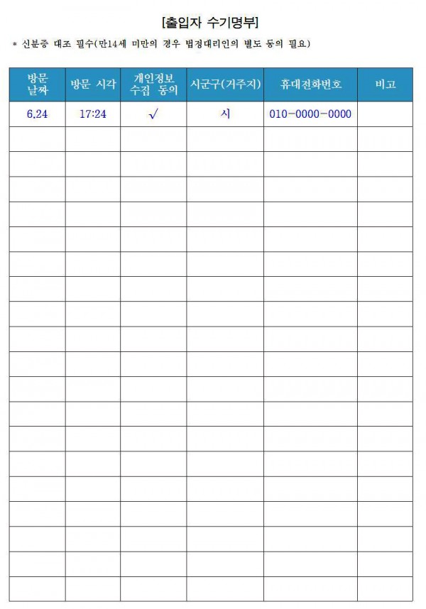 코로나19 방역지침, 출입자수기명부 format