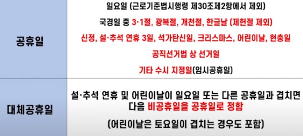 - 근로기준법 제55조제2항 및 같은 법 시행령 제30조제2항은 「관공서의 공휴일에 관한 규정」에 따른 공휴일 및 대체공휴일을 유급휴일로 보장하도록 규정하고 있으므로,