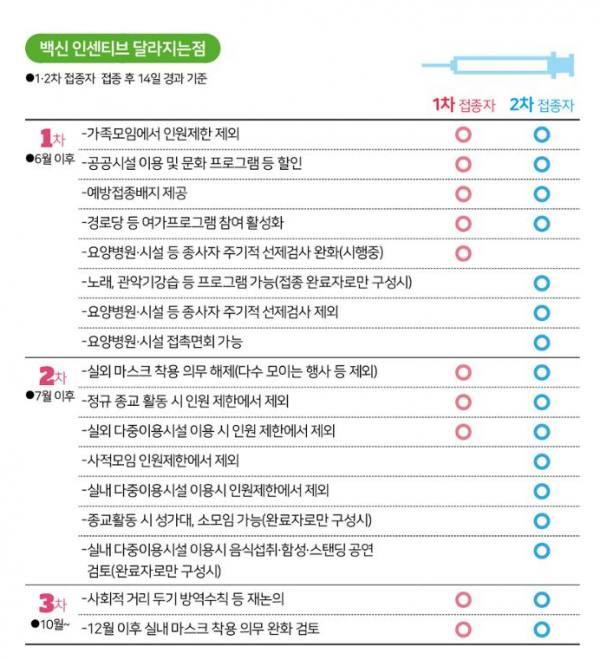 - 1차 이상 접종받으면 직계가족 모임 인원 기준에서 제외(6.1∼)
